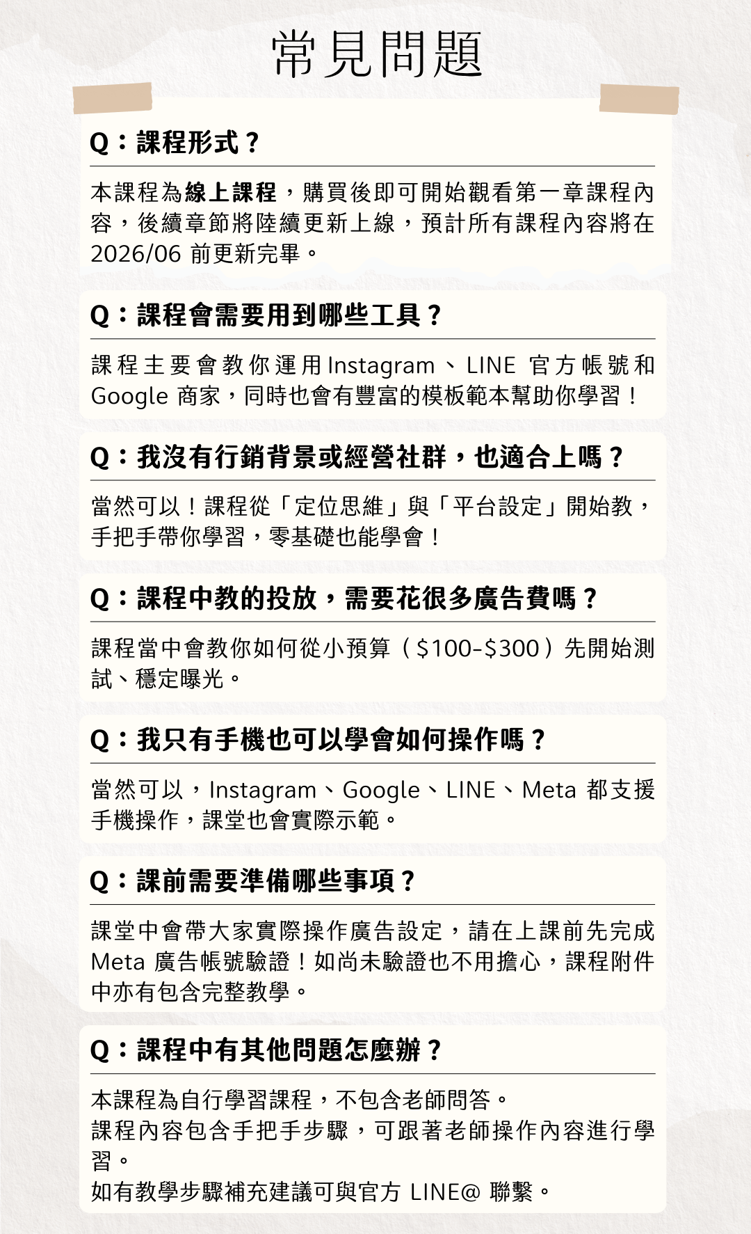 如果您對課程教學內容有任何疑問,或需要評估課程內容能否協助你想達成的學習目標,都歡迎先通過客服聯繫詢問課程相關資訊,我們會盡可能協助您於購買課程前完成評估再行訂購喔 !