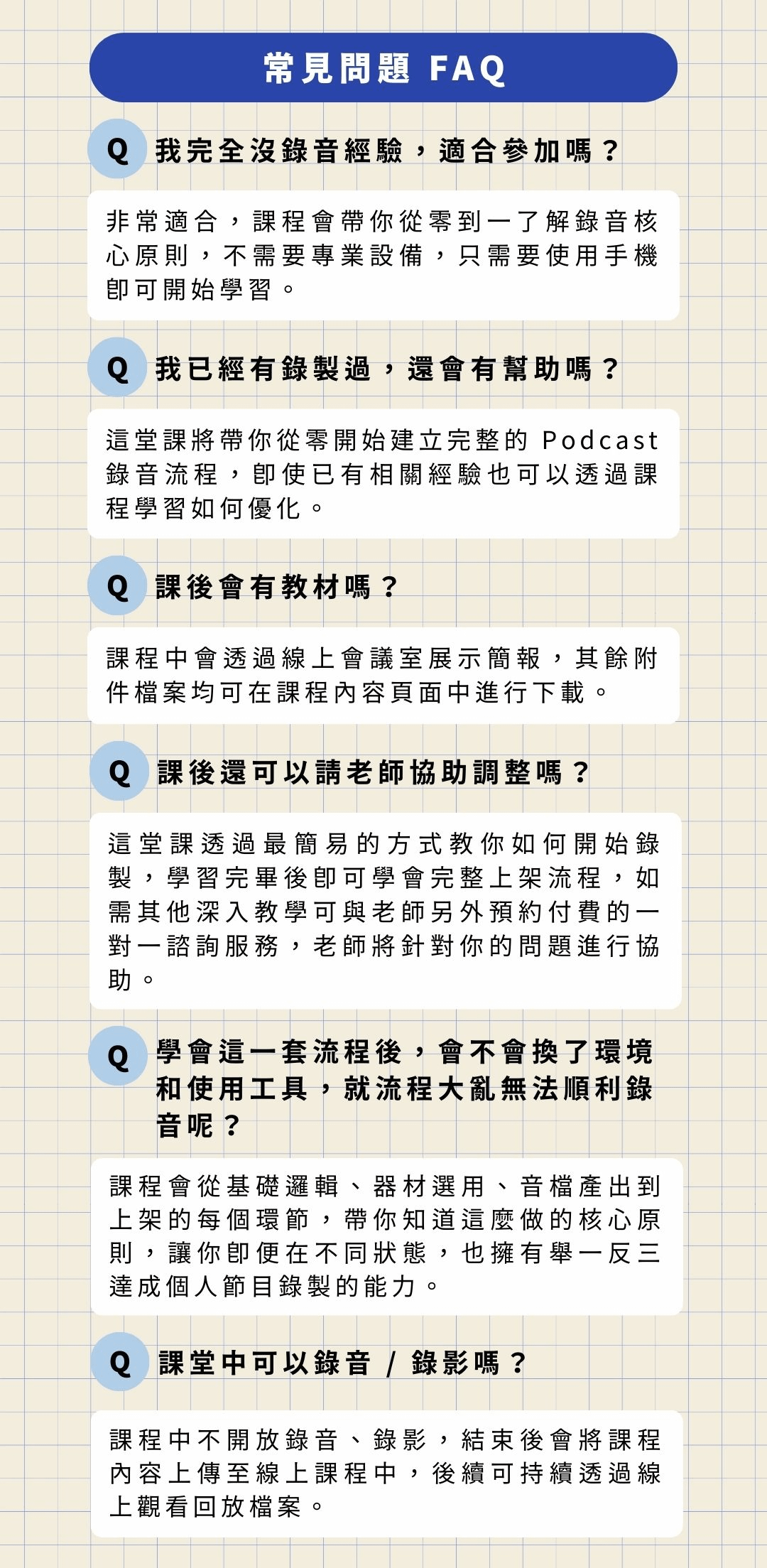 如果您對課程教學內容有任何疑問,或需要評估課程內容能否協助你想達成的學習目標,都歡迎先通過客服聯繫詢問課程相關資訊,我們會盡可能協助您於購買課程前完成評估再行訂購喔 !